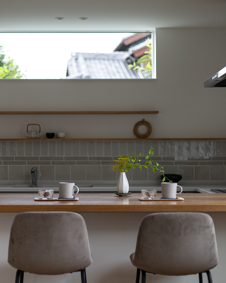 造作カンターキッチンに窓際に設けた約5mのベンチ。